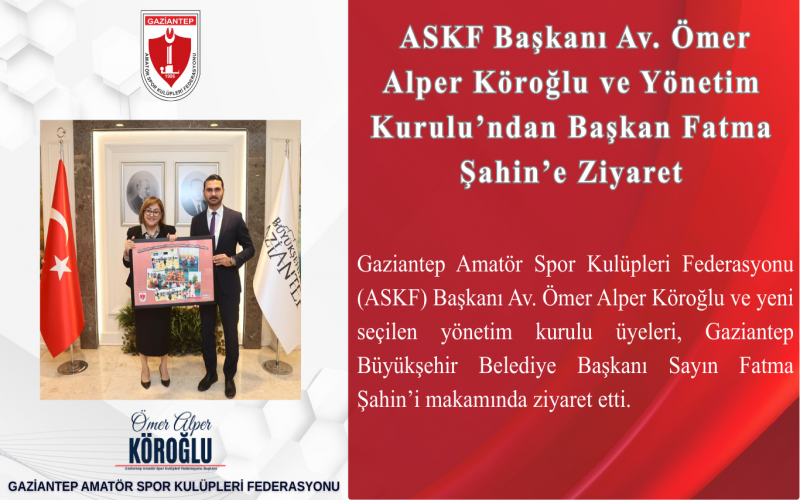 Gaziantep Amatör Spor Kulüpleri Federasyonu (ASKF) Başkanı Av. Ömer Alper Köroğlu ve yeni seçilen yönetim kurulu üyeleri, Gaziantep Büyükşehir Belediye Başkanı Sayın Fatma Şahin’i makamında ziyaret etti.