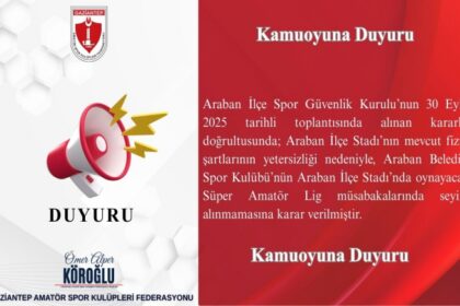 Araban İlçe Spor Güvenlik Kurulu’nun 30 Eylül 2025 tarihli toplantısında alınan kararlar doğrultusunda; Araban İlçe Stadı’nın mevcut fiziki şartlarının yetersizliği nedeniyle, Araban Belediye Spor Kul...