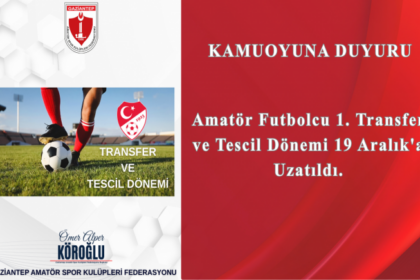 📢 KAMUOYUNA DUYURU Amatör Futbolcu 1. Transfer ve Tescil Dönemi Uzatıldı Türkiye Futbol Federasyonu tarafından yapılan açıklamaya göre; 2025–2026 sezonu Amatör Futbolcu 1. Transfer ve Tescil Döne...