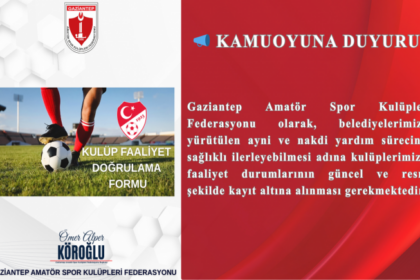 📢 Kulüp Faaliyet Doğrulama Formu Yayınlandı Gaziantep Amatör Spor Kulüpleri Federasyonu olarak, belediyelerimizle yürütülen ayni ve nakdi yardım sürecinin sağlıklı ilerleyebilmesi adına...