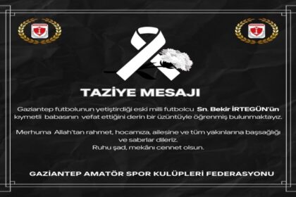 Gaziantep futbolunun yetiştirdiği eski milli futbolcu Sn. Bekir İRTEGÜN’ün kıymetli babasının vefat ettiğini derin bir üzüntüyle öğrenmiş bulunmaktayız. Merhuma Allah’tan rahme...