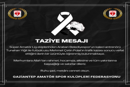 Süper Amatör Lig ekiplerinden Araban Belediyespor’un kaleci antrenörü Tunahan Yiğit ile futbolcusu Mehmet Çetin Polat’ın trafik kazası sonucu vefat ettiğini derin bir üzüntüyle öğrenmiş bulunmaktayız....