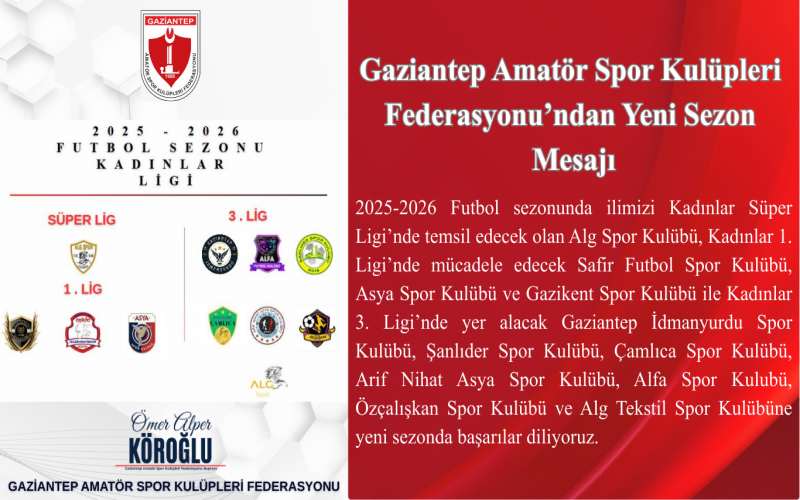 2025-2026 Futbol sezonunda ilimizi Kadınlar Süper Ligi’nde temsil edecek olan Alg Spor Kulübü, Kadınlar 1. Ligi’nde mücadele edecek Safir Futbol Spor Kulübü, Asya Spor Kulübü ve Gazikent Spor Kulübü ile Kadınlar 3. Ligi’nde yer alacak Gaziantep İdmanyurdu Spor Kulübü, Şanlıder Spor Kulübü, Çamlıca Spor Kulübü, Arif Nihat Asya Spor Kulübü, Alfa Spor Kulubü, Özçalışkan Spor Kulübü ve Alg Tekstil Spor Kulübüne yeni sezonda başarılar diliyoruz.