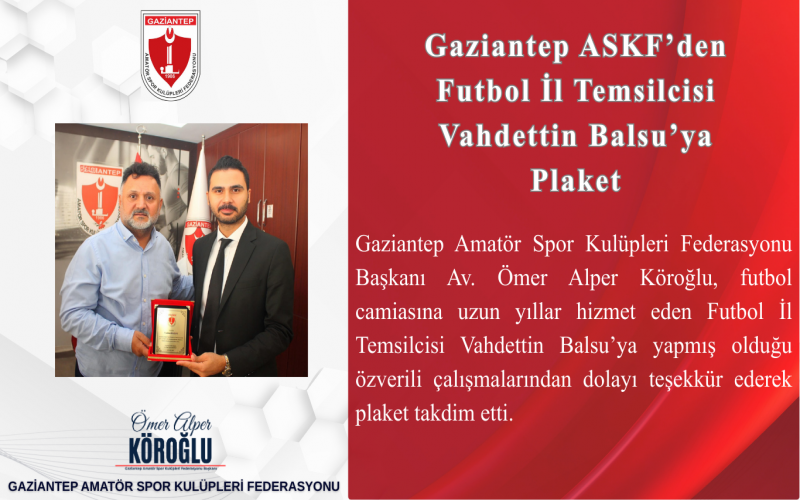 Gaziantep Amatör Spor Kulüpleri Federasyonu Başkanı Av. Ömer Alper Köroğlu, futbol camiasına uzun yıllar hizmet eden Futbol İl Temsilcisi Vahdettin Balsu’ya yapmış olduğu özverili çalışmalarından dolayı teşekkür ederek plaket takdim etti.