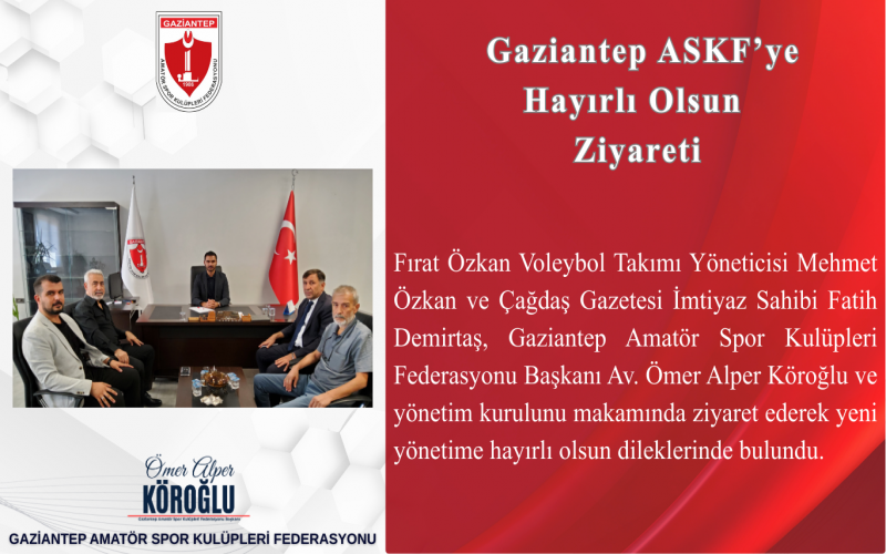 Fırat Özkan Voleybol Takımı Yöneticisi Mehmet Özkan ve Çağdaş Gazetesi İmtiyaz Sahibi Fatih Demirtaş, Gaziantep Amatör Spor Kulüpleri Federasyonu Başkanı Av. Ömer Alper Köroğlu ve yönetim kurulunu makamında ziyaret ederek yeni yönetime hayırlı olsun dileklerinde bulundu.